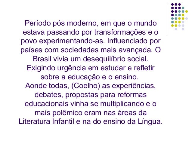 7. 7. Período pós moderno, em que o mundo estava passando por transformações e o povo experimentando-as. Influenciado porpaíses com sociedades mais avançada. O Brasil vivia um desequilíbrio social. Exigindo urgência em estudar e refletir sobre a educação e o ensino. Aonde todas, (Coelho) as experiências, debates, propostas para reformas educacionais vinha se multiplicando e o mais polêmico eram nas áreas daLiteratura Infantil e na do ensino da Língua.