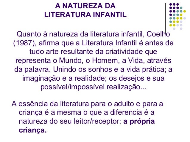 9. 9. A NATUREZA DA LITERATURA INFANTIL Quanto à natureza da literatura infantil, Coelho(1987), afirma que a Literatura Infantil é antes de tudo arte resultante da criatividade que representa o Mundo, o Homem, a Vida, atravésda palavra. Unindo os sonhos e a vida prática; a imaginação e a realidade; os desejos e sua possível/impossível realização...A essência da literatura para o adulto e para a criança é a mesma o que a diferencia é a natureza do seu leitor/receptor: a própria criança.