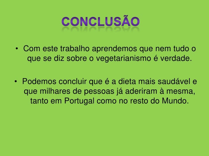 Conclusão<br />Com este trabalho aprendemos que nem tudo o que se diz sobre o vegetarianismo é verdade.<br />Podemos concl...
