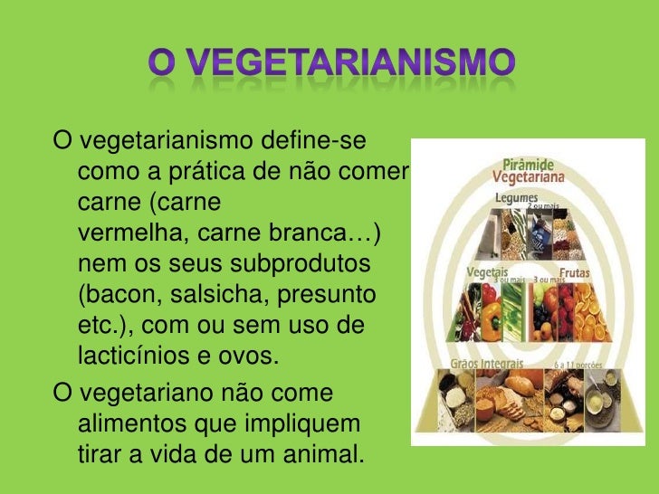 O Vegetarianismo<br />O vegetarianismo define-se como a prática de não comer carne (carne vermelha, carne branca…) nem os ...