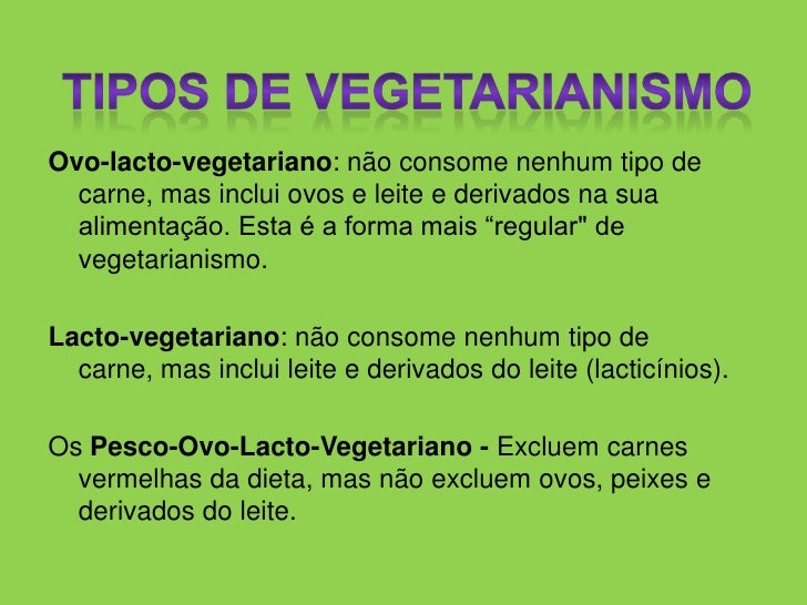 Ovo-lacto-vegetariano: não consome nenhum tipo de carne, mas inclui ovos e leite e derivados na sua alimentação. Esta é a ...