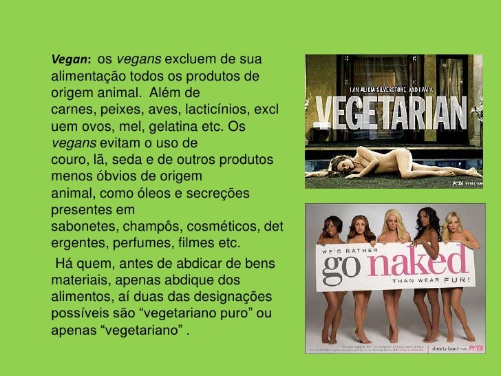 6. 6. Vegan:  os vegans excluem de sua alimentação todos os produtos de origem animal.  Além de carnes, peixes, aves, lacticínios, excluem ovos, mel, gelatina etc. Os vegans evitam o uso de couro, lã, seda e de outros produtos menos óbvios de origem animal, como óleos e secreções presentes em sabonetes, champôs, cosméticos, detergentes, perfumes, filmes etc.<br /> Há quem, antes de abdicar de bens materiais, apenas abdique dos alimentos, aí duas das designações possíveis são “vegetariano puro” ou apenas “vegetariano” . <br />