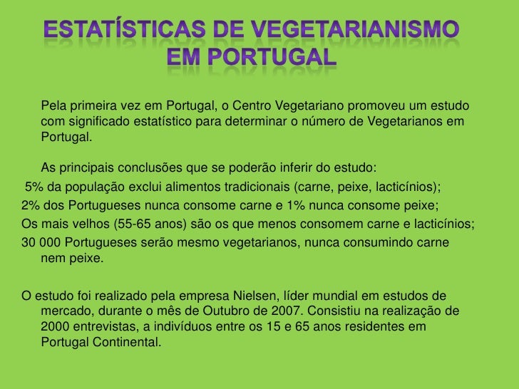 7. 7. Estatísticas de Vegetarianismo em Portugal<br />Pela primeira vez em Portugal, o Centro Vegetariano promoveu um estudo com significado estatístico para determinar o número de Vegetarianos em Portugal. As principais conclusões que se poderão inferir do estudo:<br /> 5% da população exclui alimentos tradicionais (carne, peixe, lacticínios); <br />2% dos Portugueses nunca consome carne e 1% nunca consome peixe; <br />Os mais velhos (55-65 anos) são os que menos consomem carne e lacticínios; <br />30 000 Portugueses serão mesmo vegetarianos, nunca consumindo carne nem peixe. <br />O estudo foi realizado pela empresa Nielsen, líder mundial em estudos de mercado, durante o mês de Outubro de 2007. Consistiu na realização de 2000 entrevistas, a indivíduos entre os 15 e 65 anos residentes em Portugal Continental.<br />