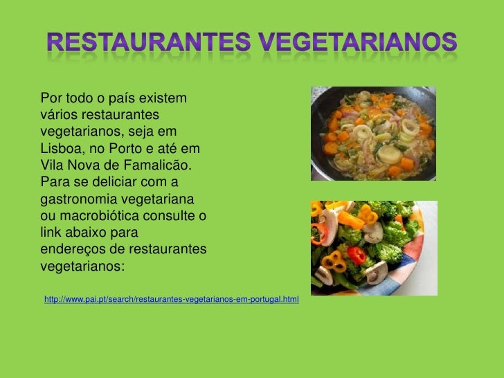 8. 8. Restaurantes Vegetarianos<br />Por todo o país existem vários restaurantes vegetarianos, seja em Lisboa, no Porto e até em Vila Nova de Famalicão. Para se deliciar com a gastronomia vegetariana ou macrobiótica consulte o link abaixo para endereços de restaurantes vegetarianos:<br />http://www.pai.pt/search/restaurantes-vegetarianos-em-portugal.html <br />