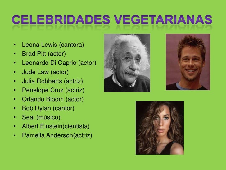 9. 9. LeonaLewis (cantora)<br />BradPitt (actor)<br />Leonardo DiCaprio (actor)<br />JudeLaw (actor)<br />JuliaRobberts (actriz)<br />Penelope Cruz (actriz)<br />Orlando Bloom (actor)<br />BobDylan (cantor)<br />Seal (músico)<br />Albert Einstein(cientista)<br />Pamella Anderson(actriz)<br />Celebridades Vegetarianas<br />