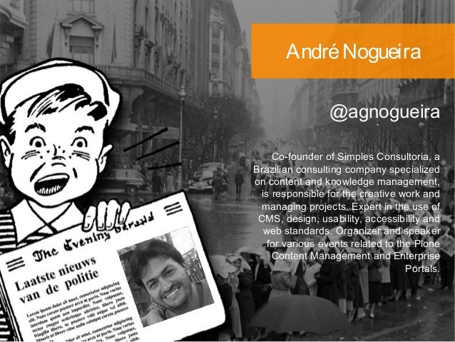 2. 2. AndréNogueira @agnogueira Co-founder of Simples Consultoria, a Brazilian consulting company specialized on content and knowledge management, is responsible for the creative work and managing projects. Expert in the use of CMS, design, usability, accessibility and web standards. Organizer and speaker for various events related to the Plone Content Management and Enterprise Portals.