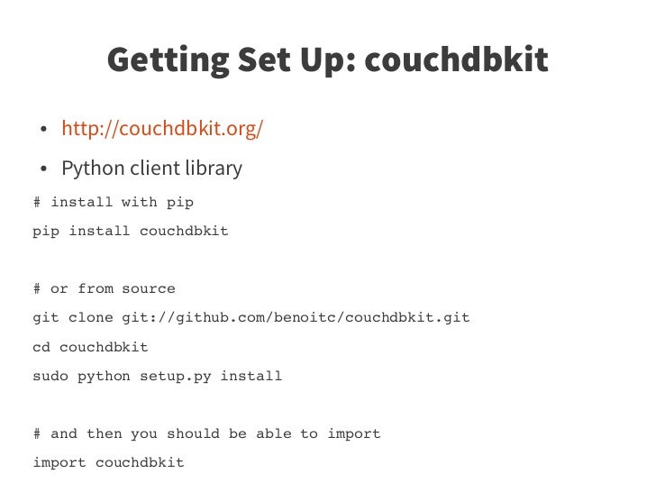 10. 10. Getting Set Up: couchdbkit ● http://couchdbkit.org/ ● Python client library # install with pip pip install couchdbkit # or from source git clone git://github.com/benoitc/couchdbkit.git cd couchdbkit  sudo python setup.py install # and then you should be able to import  import couchdbkit