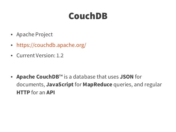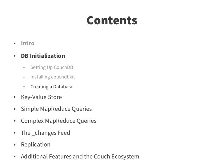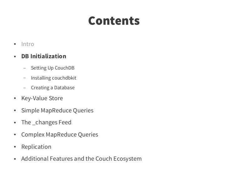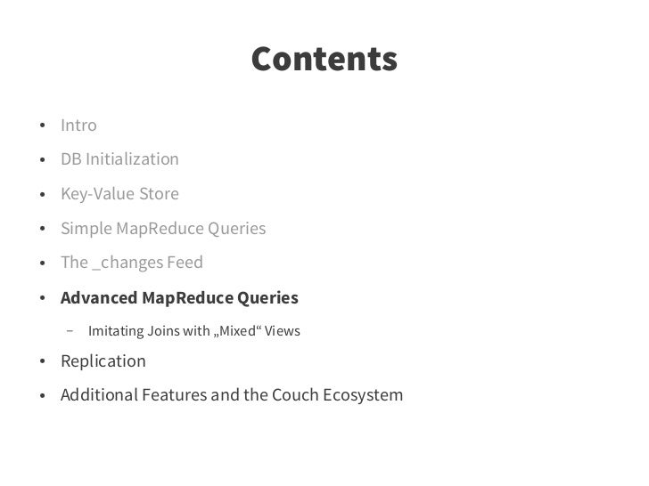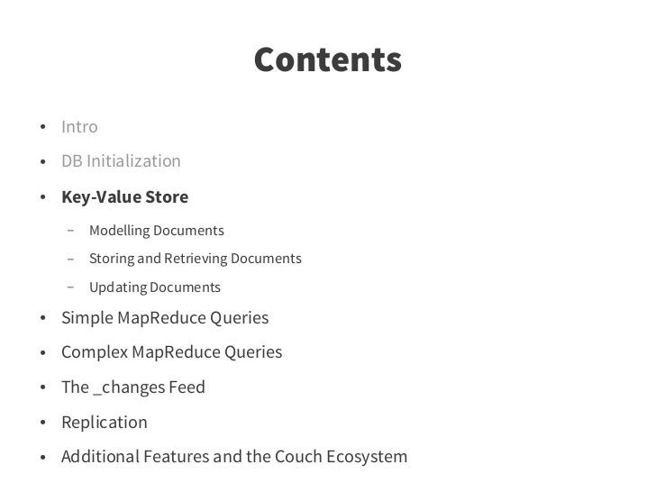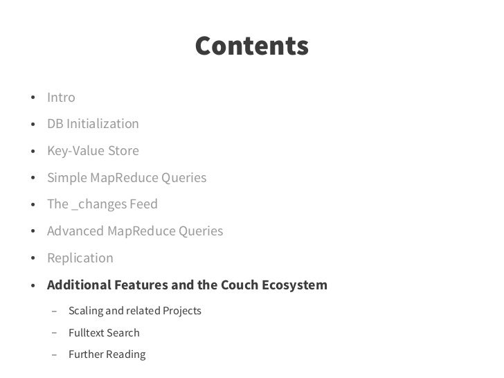 72. 72. Contents ● Intro ● DB Initialization ● Key-Value Store ● Simple MapReduce Queries ● The _changes Feed ● Advanced MapReduce Queries ● Replication ● Additional Features and the Couch Ecosystem – Scaling and related Projects – Fulltext Search – Further Reading