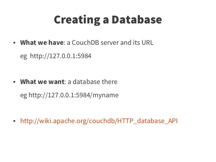 12. 12. Creating a Database ● What we have: a CouchDB server and its URL eg http://127.0.0.1:5984 ● What we want: a database there eg http://127.0.0.1:5984/myname ● http://wiki.apache.org/couchdb/HTTP_database_API