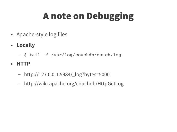 13. 13. A note on Debugging ● Apache-style log files ● Locally – $ tail ­f /var/log/couchdb/couch.log ● HTTP – http://127.0.0.1:5984/_log?bytes=5000 – http://wiki.apache.org/couchdb/HttpGetLog
