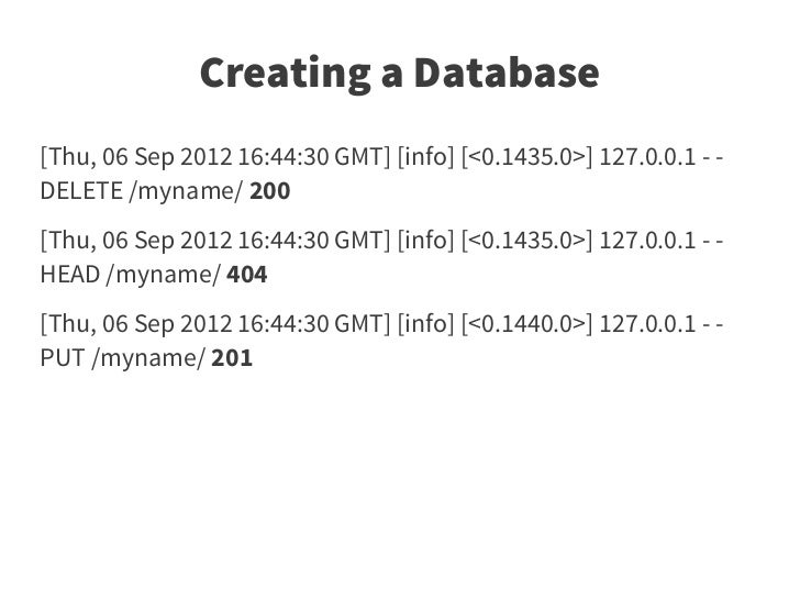 15. 15. Creating a Database [Thu, 06 Sep 2012 16:44:30 GMT] [info] [<0.1435.0>] 127.0.0.1 - - DELETE /myname/ 200 [Thu, 06 Sep 2012 16:44:30 GMT] [info] [<0.1435.0>] 127.0.0.1 - - HEAD /myname/ 404 [Thu, 06 Sep 2012 16:44:30 GMT] [info] [<0.1440.0>] 127.0.0.1 - - PUT /myname/ 201