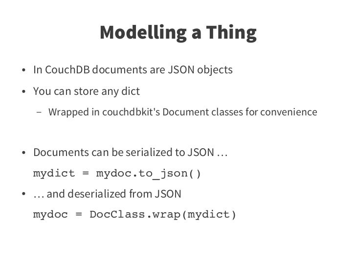 19. 19. Modelling a Thing ● In CouchDB documents are JSON objects ● You can store any dict – Wrapped in couchdbkit's Document classes for convenience ● Documents can be serialized to JSON … mydict = mydoc.to_json() ● … and deserialized from JSON mydoc = DocClass.wrap(mydict)