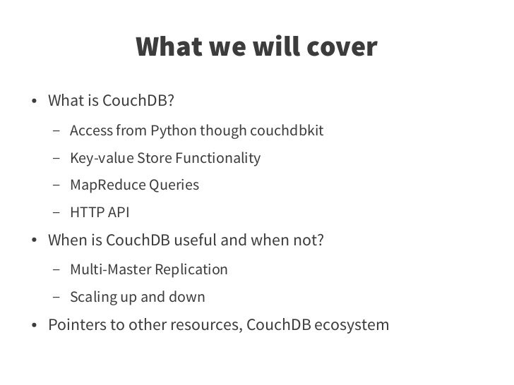 2. 2. What we will cover ● What is CouchDB? – Access from Python though couchdbkit – Key-value Store Functionality – MapReduce Queries – HTTP API ● When is CouchDB useful and when not? – Multi-Master Replication – Scaling up and down ● Pointers to other resources, CouchDB ecosystem