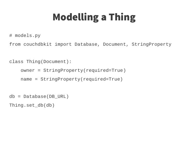 20. 20. Modelling a Thing # models.py from couchdbkit import Database, Document, StringProperty class Thing(Document): owner = StringProperty(required=True) name = StringProperty(required=True) db = Database(DB_URL) Thing.set_db(db)