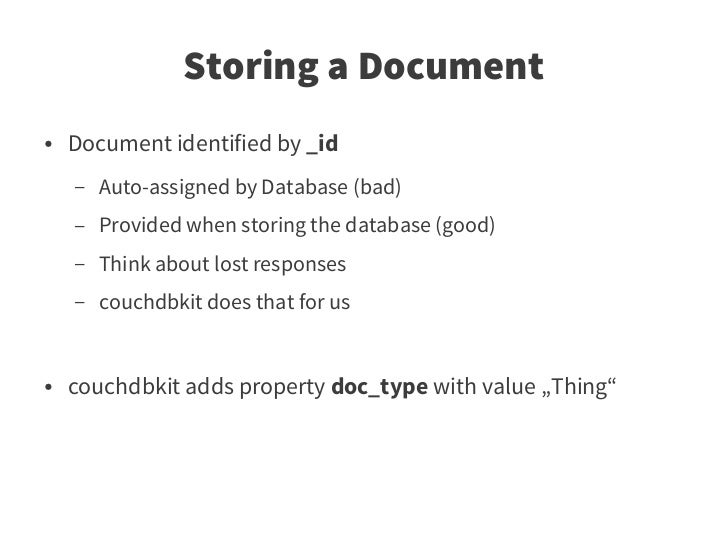 21. 21. Storing a Document ● Document identified by _id – Auto-assigned by Database (bad) – Provided when storing the database (good) – Think about lost responses – couchdbkit does that for us ● couchdbkit adds property doc_type with value „Thing“
