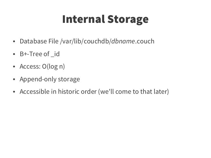 22. 22. Internal Storage ● Database File /var/lib/couchdb/dbname.couch ● B+-Tree of _id ● Access: O(log n) ● Append-only storage ● Accessible in historic order (we'll come to that later)