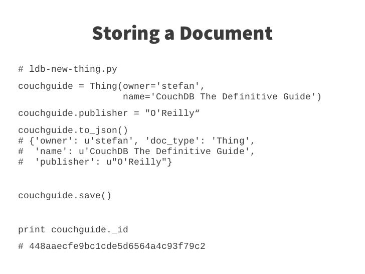 23. 23. Storing a Document # ldb-new-thing.py couchguide = Thing(owner='stefan', name='CouchDB The Definitive Guide') couchguide.publisher = "O'Reilly“ couchguide.to_json() # {'owner': u'stefan', 'doc_type': 'Thing', # 'name': u'CouchDB The Definitive Guide', # 'publisher': u"O'Reilly"} couchguide.save() print couchguide._id # 448aaecfe9bc1cde5d6564a4c93f79c2