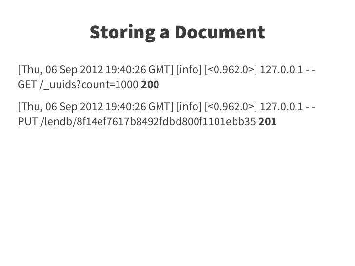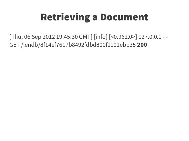 26. 26. Retrieving a Document [Thu, 06 Sep 2012 19:45:30 GMT] [info] [<0.962.0>] 127.0.0.1 - - GET /lendb/8f14ef7617b8492fdbd800f1101ebb35 200