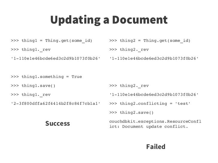 28. 28. Updating a Document >>> thing1 = Thing.get(some_id) >>> thing2 = Thing.get(some_id) >>> thing1._rev >>> thing2._rev '1­110e1e46bcde6ed3c2d9b1073f0b26' '1­110e1e46bcde6ed3c2d9b1073f0b26' >>> thing1.something = True >>> thing1.save() >>> thing2._rev >>> thing1._rev '1­110e1e46bcde6ed3c2d9b1073f0b26' '2­3f800dffa62f4414b2f8c84f7cb1a1' >>> thing2.conflicting = 'test' >>> thing2.save() Success couchdbkit.exceptions.ResourceConfl ict: Document update conflict. Failed
