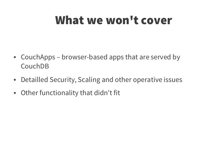 3. 3. What we won't cover ● CouchApps – browser-based apps that are served by CouchDB ● Detailled Security, Scaling and other operative issues ● Other functionality that didn't fit