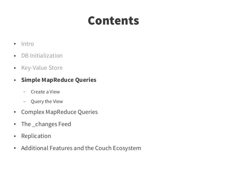 30. 30. Contents ● Intro ● DB Initialization ● Key-Value Store ● Simple MapReduce Queries – Create a View – Query the View ● Complex MapReduce Queries ● The _changes Feed ● Replication ● Additional Features and the Couch Ecosystem
