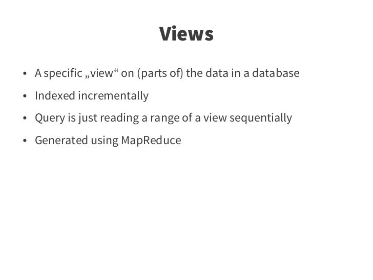 31. 31. Views ● A specific „view“ on (parts of) the data in a database ● Indexed incrementally ● Query is just reading a range of a view sequentially ● Generated using MapReduce