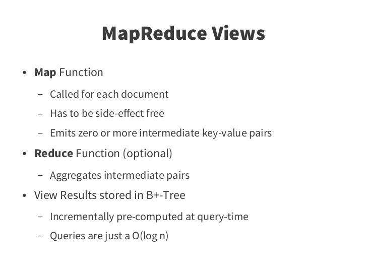 32. 32. MapReduce Views ● Map Function – Called for each document – Has to be side-effect free – Emits zero or more intermediate key-value pairs ● Reduce Function (optional) – Aggregates intermediate pairs ● View Results stored in B+-Tree – Incrementally pre-computed at query-time – Queries are just a O(log n)