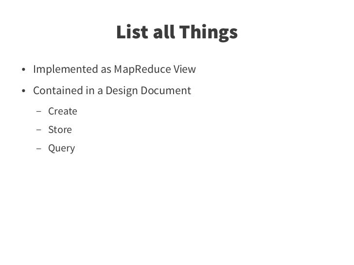 33. 33. List all Things ● Implemented as MapReduce View ● Contained in a Design Document – Create – Store – Query
