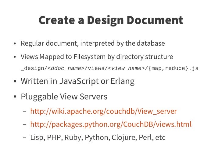 34. 34. Create a Design Document ● Regular document, interpreted by the database ● Views Mapped to Filesystem by directory structure _design/<ddoc name>/views/<view name>/{map,reduce}.js ● Written in JavaScript or Erlang ● Pluggable View Servers – http://wiki.apache.org/couchdb/View_server – http://packages.python.org/CouchDB/views.html – Lisp, PHP, Ruby, Python, Clojure, Perl, etc