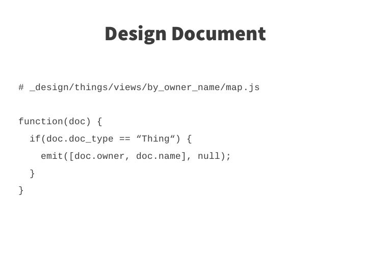 35. 35. Design Document # _design/things/views/by_owner_name/map.js function(doc) { if(doc.doc_type == “Thing“) { emit([doc.owner, doc.name], null); } }