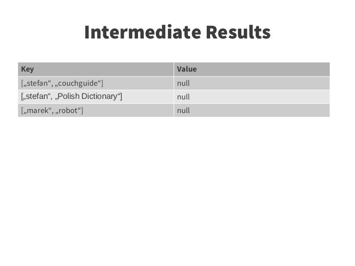 36. 36. Intermediate Results Key Value [„stefan“, „couchguide“] null [„stefan“, „Polish Dictionary“] null [„marek“, „robot“] null