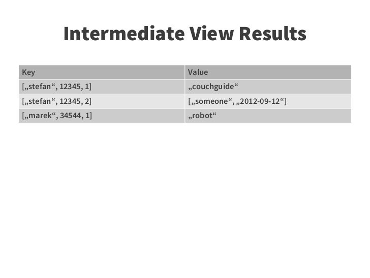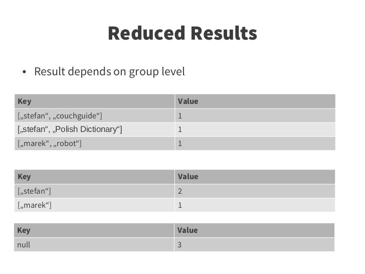 38. 38. Reduced Results ● Result depends on group level Key Value [„stefan“, „couchguide“] 1 [„stefan“, „Polish Dictionary“] 1 [„marek“, „robot“] 1 Key Value [„stefan“] 2 [„marek“] 1 Key Value null 3