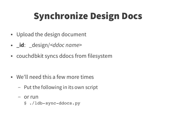40. 40. Synchronize Design Docs # ldb­sync­ddocs.py from couchdbkit.loaders import FileSystemDocsLoader auth_filter = BasicAuth('username', 'pwd') db = Database(dburl, filters=[auth_filter]) loader = FileSystemDocsLoader('_design') loader.sync(db, verbose=True)