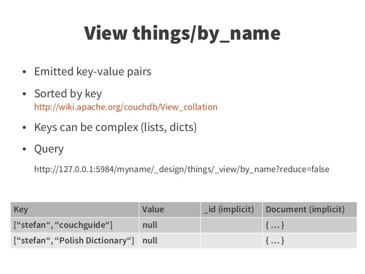 41. 41. View things/by_name ● Emitted key-value pairs ● Sorted by key http://wiki.apache.org/couchdb/View_collation ● Keys can be complex (lists, dicts) ● Query http://127.0.0.1:5984/myname/_design/things/_view/by_name?reduce=false Key Value _id (implicit) Document (implicit) [“stefan“, “couchguide“] null {…} [“stefan“, “Polish Dictionary“] null {…}