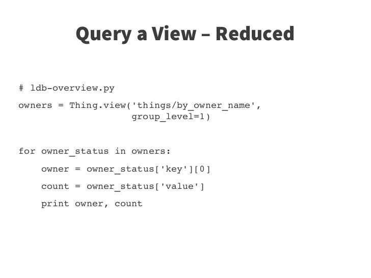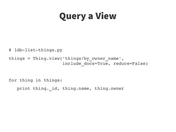 43. 43. Query a View – Reduced # ldb­overview.py owners = Thing.view('things/by_owner_name',                     group_level=1) for owner_status in owners:     owner = owner_status['key'][0]     count = owner_status['value']     print owner, count