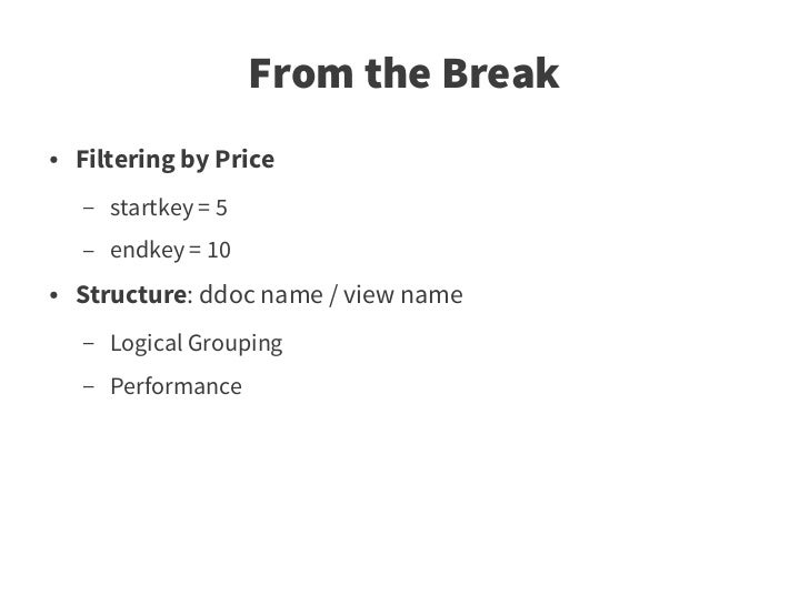 45. 45. From the Break ● Filtering by Price – startkey = 5 – endkey = 10 ● Structure: ddoc name / view name – Logical Grouping – Performance