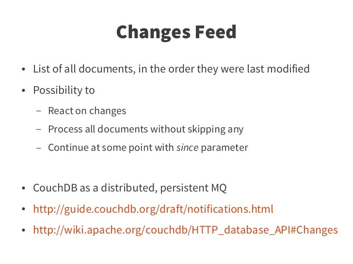 48. 48. Changes Feed ● List of all documents, in the order they were last modified ● Possibility to – React on changes – Process all documents without skipping any – Continue at some point with since parameter ● CouchDB as a distributed, persistent MQ ● http://guide.couchdb.org/draft/notifications.html ● http://wiki.apache.org/couchdb/HTTP_database_API#Changes