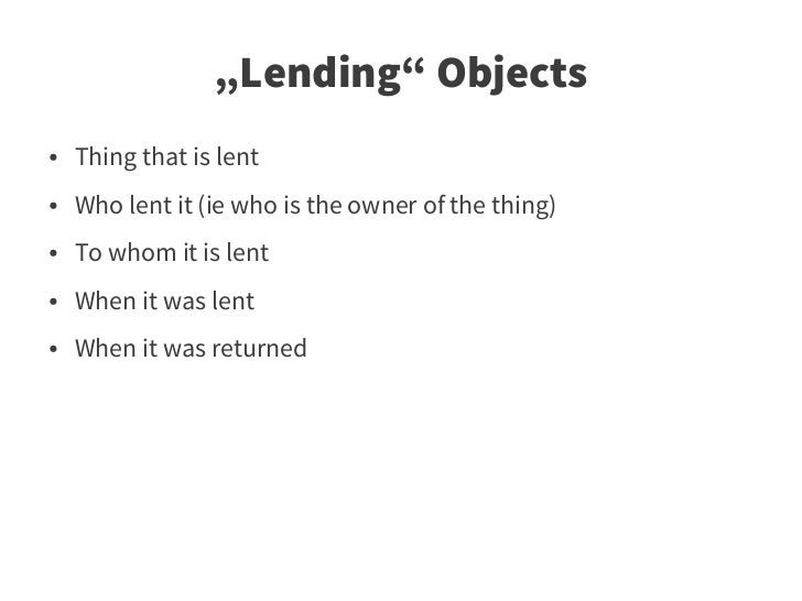 50. 50. „Lending“ Objects ● Thing that is lent ● Who lent it (ie who is the owner of the thing) ● To whom it is lent ● When it was lent ● When it was returned