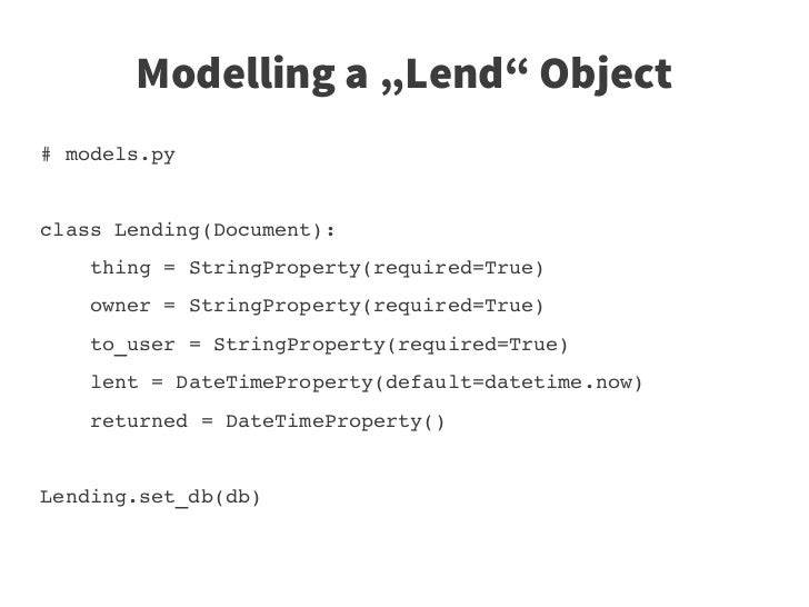 51. 51. Modelling a „Lend“ Object # models.py  class Lending(Document):     thing = StringProperty(required=True)     owner = StringProperty(required=True)     to_user = StringProperty(required=True)     lent = DateTimeProperty(default=datetime.now)     returned = DateTimeProperty() Lending.set_db(db)
