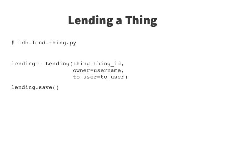 52. 52. Lending a Thing # ldb­lend­thing.py lending = Lending(thing=thing_id,                   owner=username,                   to_user=to_user)            lending.save()