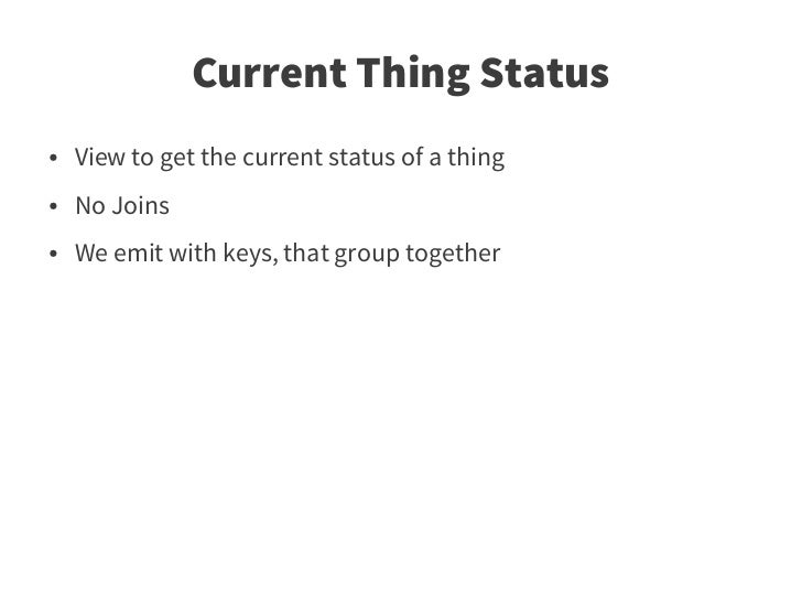 55. 55. Current Thing Status ● View to get the current status of a thing ● No Joins ● We emit with keys, that group together