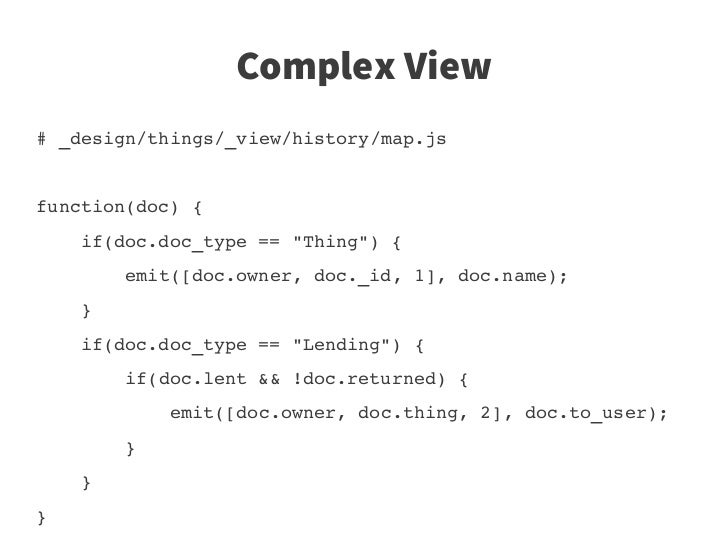 56. 56. Complex View # _design/things/_view/history/map.js function(doc) {     if(doc.doc_type == "Thing") {         emit([doc.owner, doc._id, 1], doc.name);     }     if(doc.doc_type == "Lending") {         if(doc.lent && !doc.returned) {             emit([doc.owner, doc.thing, 2], doc.to_user);         }     } }
