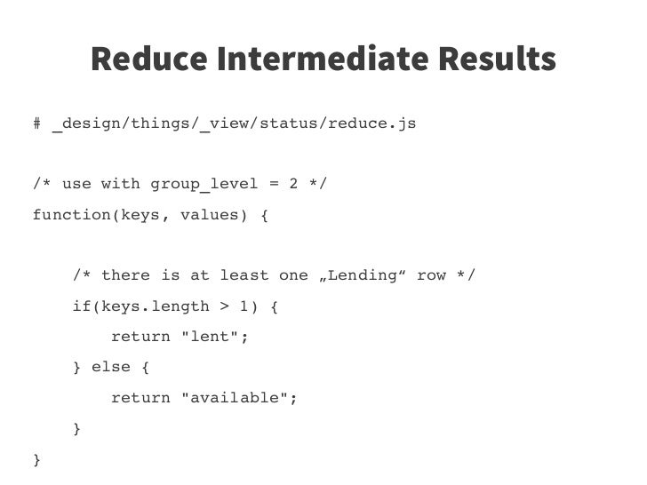 58. 58. Reduce Intermediate Results # _design/things/_view/status/reduce.js /* use with group_level = 2 */ function(keys, values) {          /* there is at least one „Lending“ row */     if(keys.length > 1) {         return "lent";     } else {         return "available";     } }