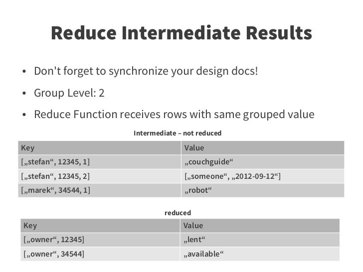 59. 59. Reduce Intermediate Results ● Don't forget to synchronize your design docs! ● Group Level: 2 ● Reduce Function receives rows with same grouped value Intermediate – not reduced Key Value [„stefan“, 12345, 1] „couchguide“ [„stefan“, 12345, 2] [„someone“, „2012-09-12“] [„marek“, 34544, 1] „robot“ reduced Key Value [„owner“, 12345] „lent“ [„owner“, 34544] „available“