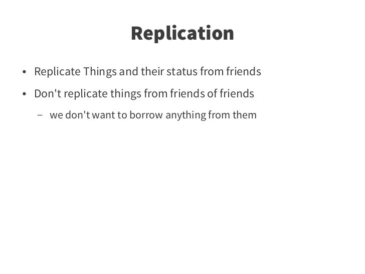 62. 62. Replication ● Replicate Things and their status from friends ● Don't replicate things from friends of friends – we don't want to borrow anything from them