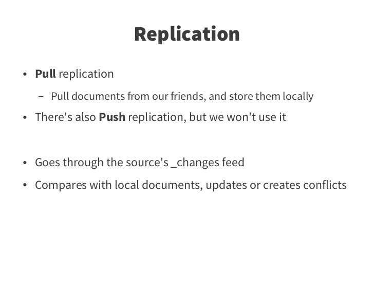63. 63. Replication ● Pull replication – Pull documents from our friends, and store them locally ● There's also Push replication, but we won't use it ● Goes through the source's _changes feed ● Compares with local documents, updates or creates conflicts