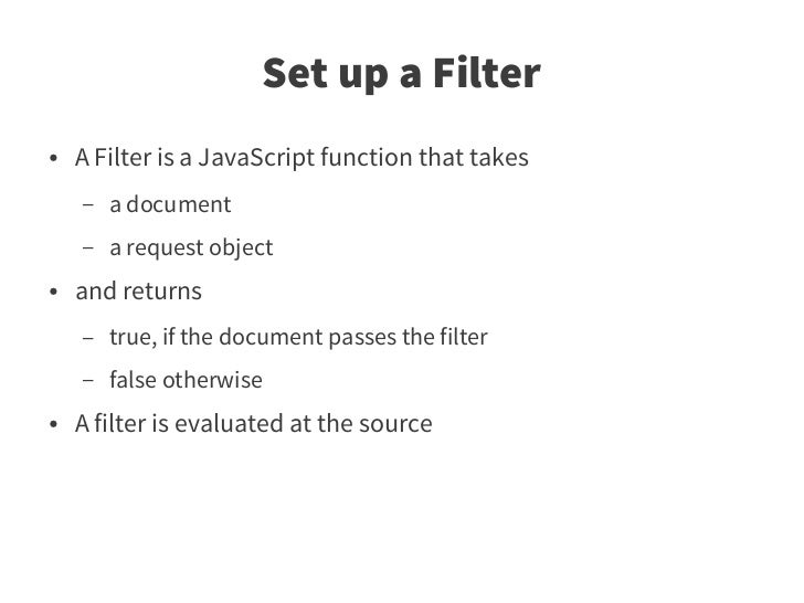 64. 64. Set up a Filter ● A Filter is a JavaScript function that takes – a document – a request object ● and returns – true, if the document passes the filter – false otherwise ● A filter is evaluated at the source