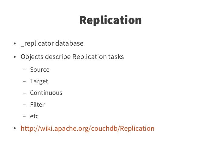 67. 67. Replication ● _replicator database ● Objects describe Replication tasks – Source – Target – Continuous – Filter – etc ● http://wiki.apache.org/couchdb/Replication