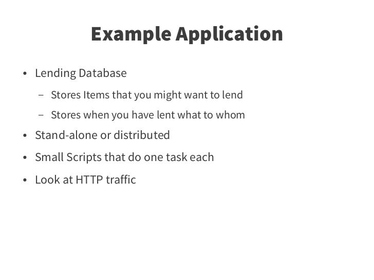 7. 7. Example Application ● Lending Database – Stores Items that you might want to lend – Stores when you have lent what to whom ● Stand-alone or distributed ● Small Scripts that do one task each ● Look at HTTP traffic