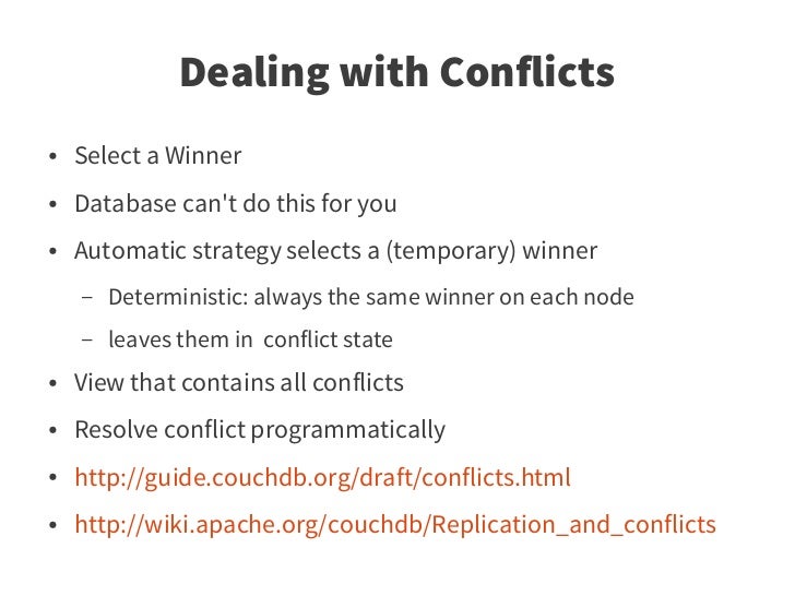 71. 71. Dealing with Conflicts ● Select a Winner ● Database can't do this for you ● Automatic strategy selects a (temporary) winner – Deterministic: always the same winner on each node – leaves them in conflict state ● View that contains all conflicts ● Resolve conflict programmatically ● http://guide.couchdb.org/draft/conflicts.html ● http://wiki.apache.org/couchdb/Replication_and_conflicts